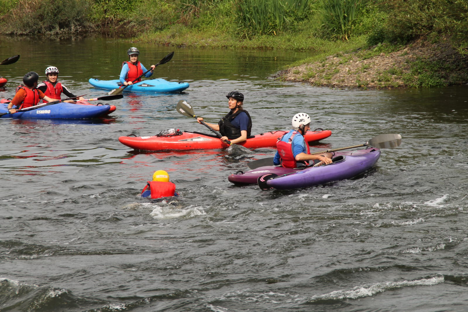 Zunächst unsicher über die durchaus vorhandene Strömung auf der Ruhr gewöhnten sich unsere Anfänger*innen rasch an die Gegebenheiten. In die Kehrwässer hinter den Buhnen (und anschließend wieder in die Strömung hinaus) paddelten die bunten Bötchen alsbald mehr oder weniger souverän – aber immer mit viel Spaß. Nach der Pause am Wehr in Hattingen trauten sich alle Teilnehmer*innen zu, die Bootsrutsche hinunterzufahren. Und nur eine Person kenterte an dessen Ende!